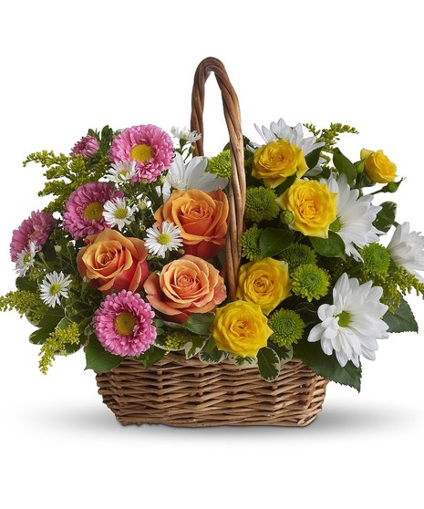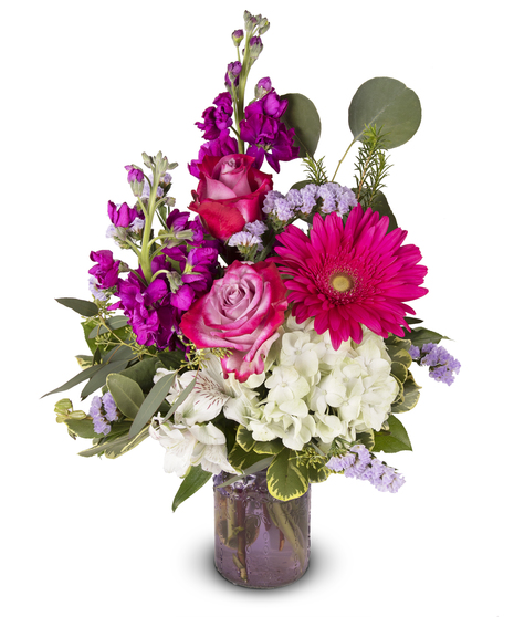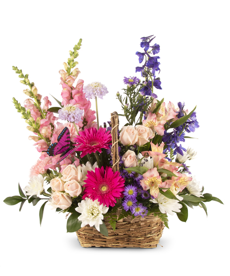 This beautiful blooms basket is the perfect way to brighten someone's day. Made with purple, white and pink flowers like gerbera daisies, alstroemeria, snap dragons, blue delphium and more! This festive basket will be a welcome addition to any room in the house.