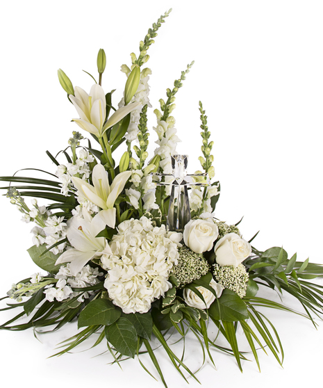 An elegant display of faith and divine peace, this beautiful arrangement will comfort the bereaved in a truly thoughtful and respectful way. An exquisite crystal cross is surrounded by a bed of lovely white blooms. It is sure to be appreciated and always remembered.