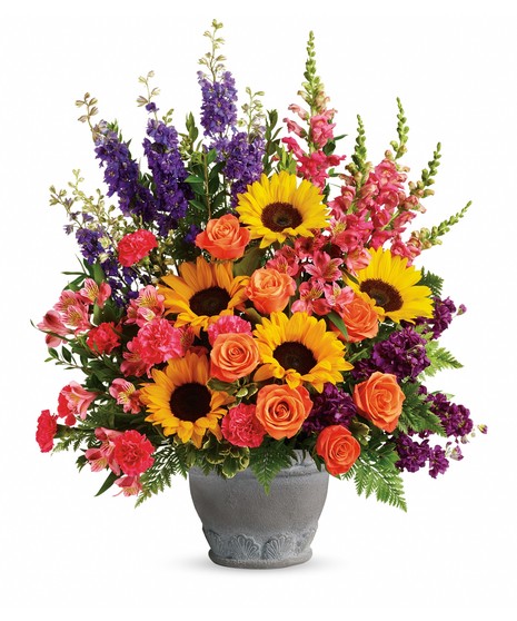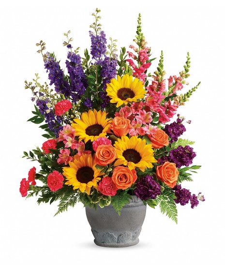 A colorful reminder that brighter days are ahead, this uplifting arrangement of sunflowers and roses in an elegant large sympathy urn brings joy and hope.