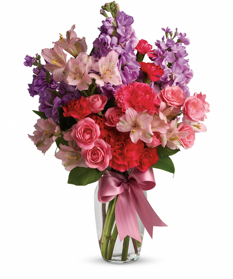 Someone you know will jump for joy when she receives this charming bouquet. Soft and feminine colors, flowers and textures are all wrapped up in one pretty package.