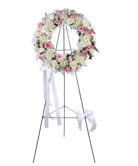 Celebrate their life with the perfect sympathy offering of flowers. The white and pink Just Like Heaven wreath, is a beautiful mix of roses, spray roses, hydrangeas, and fuji mums accented with babies breath, and is the symbol of health and brightness from one horizon to the next.