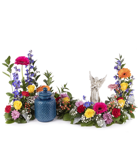 This beautiful arrangement is perfect to display around your loved one's ashes and a picture or angel. This arrangement is a magnificent way to say goodbye.